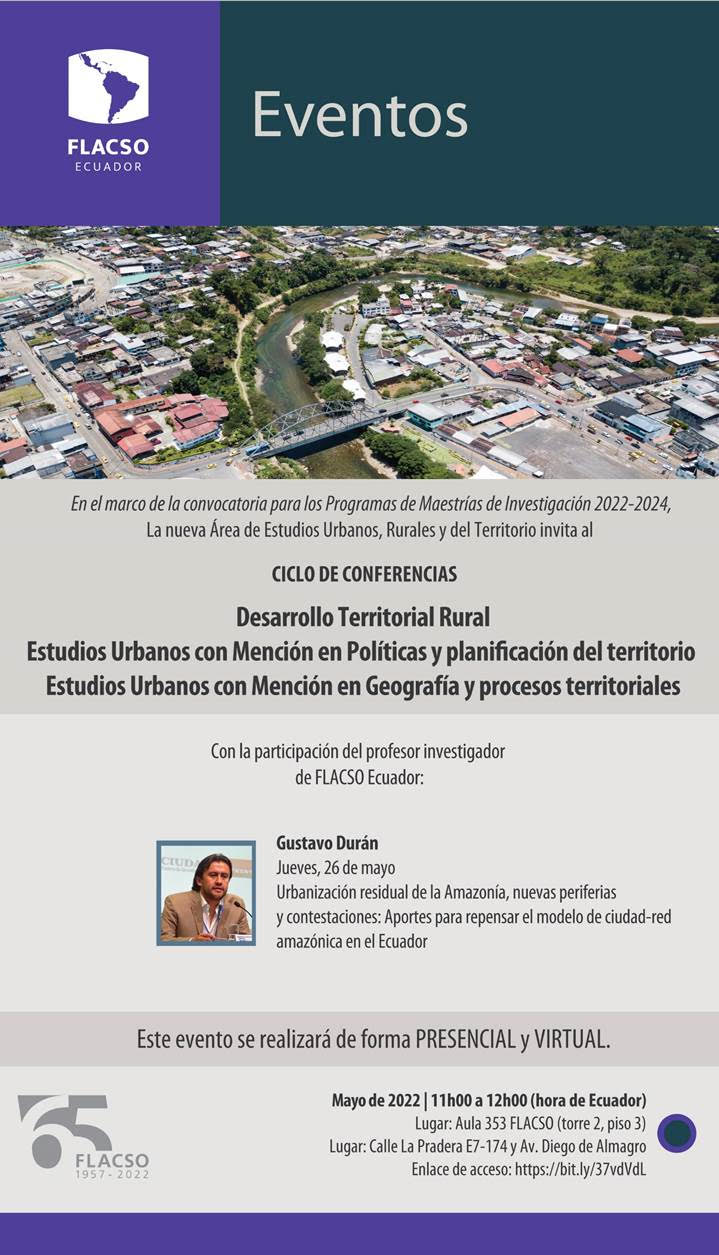 FLACSO Ecuador : Desarrollo, Ambiente y Territorio – Ciclo de conferencias desarrollo territorial rural estudios urbanos con mención en políticas y planificación del territorio - estudios urbanos con mención en geografía y procesos territoriales, 26 de mayo de 2022 - 11:00 – 12:00 - FLACSO Ecuador, Quito. Un evento organizado en el marco de la convocatoria para los Programas de Maestrías de Investigación 2022-2024, La nueva Área de Estudios Urbanos, Rurales y del Territorio.