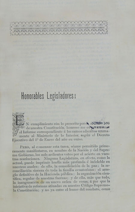 [ s.n ]. 1901. [Informe del Ministro de lo Interior y Policía, Beneficencia, etc. al Congreso Ordinario de 1901]. [Quito, Ecuador : s.n.]