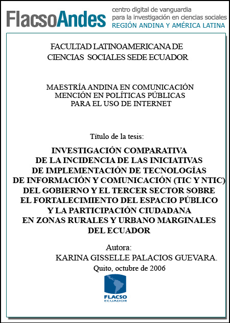 Palacios Guevara, Karina Gisselle (2006). Investigación comparativa de la incidencia de las iniciativas de implementación de tecnologías de información y comunicación (TIC y NTIC) del gobierno y el tercer sector sobre el fortalecimiento del espacio público y la participación ciudadana en zonas rurales y urbano marginales del Ecuador. Maestría Andina en Comunicación con mención en Políticas Públicas; FLACSO - Sede Ecuador. Quito 231 p.