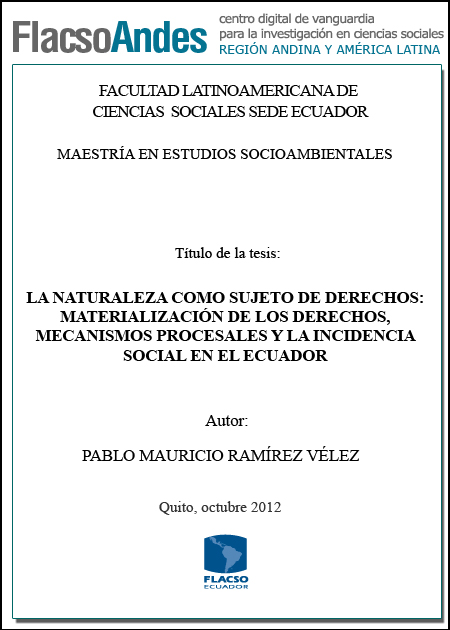 Ramírez Vélez, Pablo Mauricio (2012). La naturaleza como sujeto de derechos : materialización de los derechos, mecanismos procesales y la incidencia social en el Ecuador. Maestría en Estudios Socioambientales, FLACSO Sede Ecuador. Quito, 148 p.