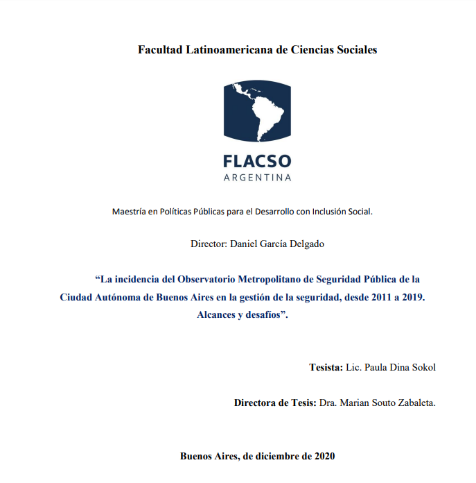 Sokol, Paula Dina. (2020). La incidencia del Observatorio Metropolitano de Seguridad Pública de la Ciudad Autónoma de Buenos Aires en la gestión de la seguridad, desde 2011 a 2019 : alcances y desafíos, Tesis de Maestría. FLACSO. Sede Académica Argentina, Buenos Aires.