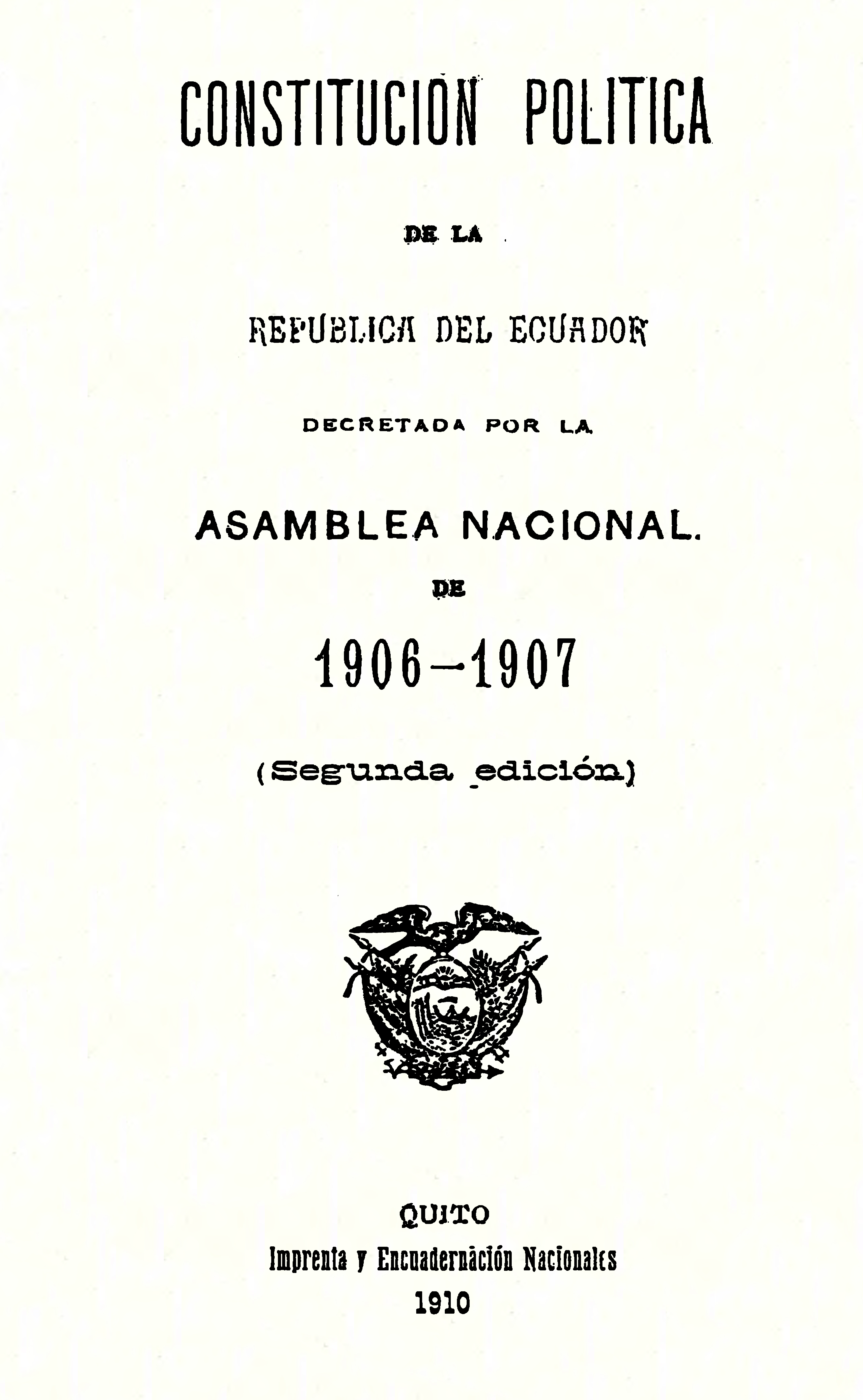 1910. Constitución Política de la República del Ecuador : decretada por la Asamblea Nacional de 1906-1907. Segunda edición. Quito, Ecuador : Imprenta y Encuadernación Nacionales.