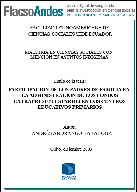 Andrando Barahona, Andrés (2003). Participación de los padres de familia en la administración de los fondos extrapresupuestarios en los centros educativos primarios. Maestría en Ciencias Sociales con mención en Asuntos Indígenas; FLACSO - Sede Ecuador. Quito. 153 p.