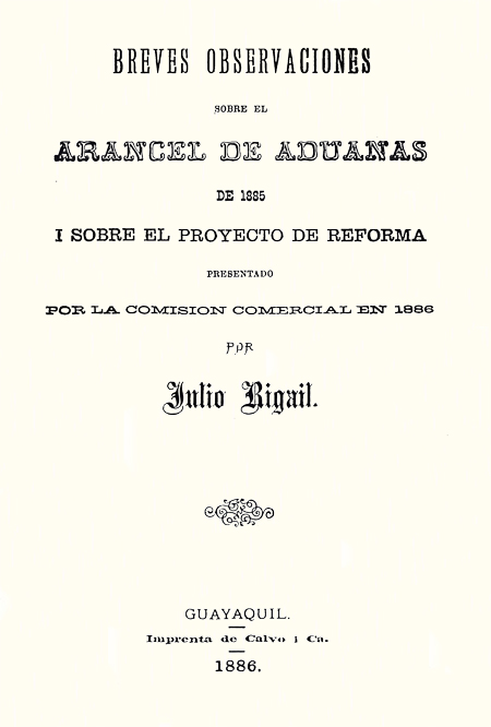 Rigail, Julio. 1886. Breves observaciones sobre el Arancel de Aduanas de 1885 i sobre el proyecto de reforma presentado por la Comisión Comercial en 1886. Guayaquil, Ecuador : Imprenta de Calvo I Ca.