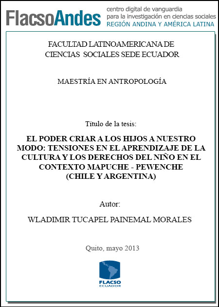Painemal Morales, Wladimir Tucapel. 2013. El poder criar a los hijos a nuestro modo: tensiones en el aprendizaje de la cultura y los derechos del niño en contexto mapuche-pewenche (Chile y Argentina). Tesis de maestría, Flacso Ecuador.