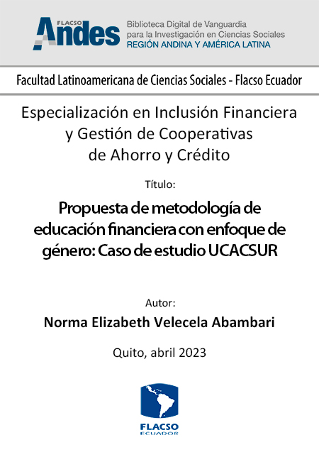 Velecela Abambari, Norma Elizabeth. 2023. Propuesta de metodología de educación financiera con enfoque de género: Caso de estudio UCACSUR. Tesina de especialización, Flacso Ecuador.