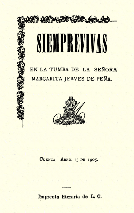 1905. Siemprevivas en la tumba de la señora Margarita Jerves de Peña. Cuenca, Ecuador : Imprenta Literaria de L.C.