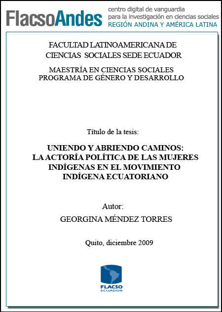 Méndez Torres, Georgina (2009). Uniendo y abriendo caminos : la actoría política de las mujeres indígenas en el movimiento indígena ecuatoriano. Maestría en Ciencias Sociales. Programa de Género y Desarrollo. FLACSO, Sede Ecuador. Quito. 89 p.
