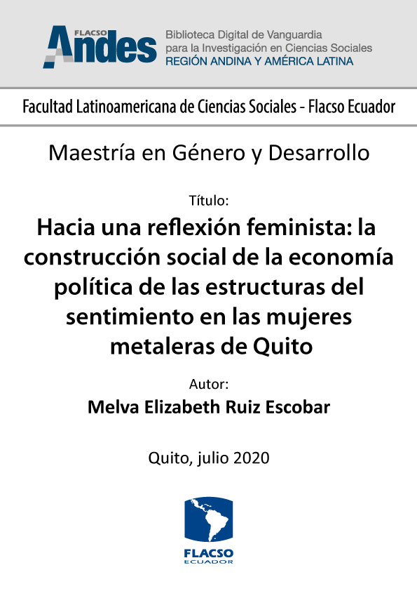 Ruiz Escobar, Melva Elizabeth. 2020. Hacia una reflexión feminista: la construcción social de la economía política de las estructuras del sentimiento en las mujeres metaleras de Quito. Tesis de maestría, Flacso Ecuador.