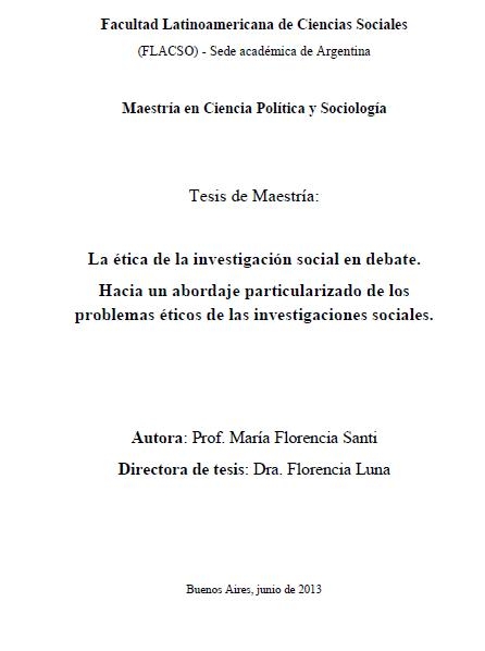 Santi, María Florencia (2013). La ética de la investigación social en debate : hacia un abordaje particularizado de los problemas éticos de las investigaciones sociales. Tesis de Maestría. FLACSO. Sede Académica Argentina, Buenos Aires.