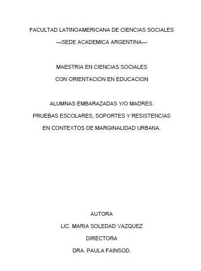 Vázquez, María Soledad (2013). Alumnas embarazadas y/o madres : pruebas escolares, soportes y resistencias en contextos de marginalidad urbana. Tesis de Maestría. FLACSO. Sede Académica Argentina, Buenos Aires.