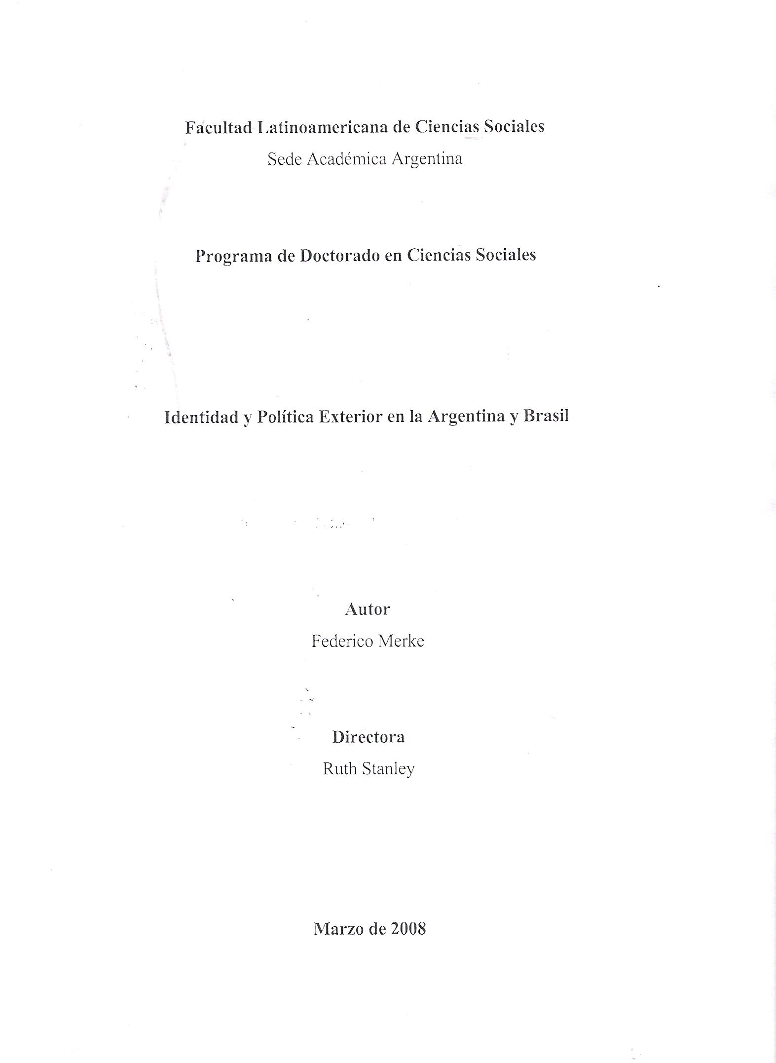 Merke, Federico (2008). Identidad y política exterior en Argentina y Brasil. Tesis de Doctorado. FLACSO. Sede Académica Argentina, Buenos Aires.