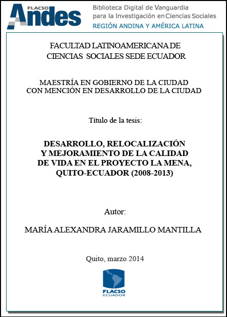 Jaramillo Mantilla, María Alexandra. 2014. Desarrollo, relocalización y mejoramiento de la calidad de vida en el proyecto la Mena, Quito-Ecuador, (2008-2013). Tesis de maestría, Flacso Ecuador.