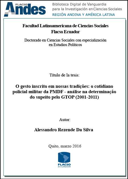 Silva, Alessandro Rezende Da. 2016. O gesto inscrito em nossas tradições: o cotidiano policial militar DA PMDF - análise na determinação do suspeito pelo GTOP (2001-2011). Tesis de maestría, Flacso Ecuador.