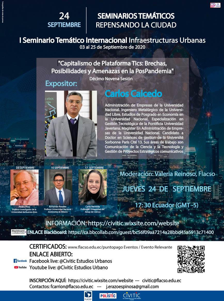 Caicedo, Carlos. 2020. Capitalismo de plataforma Tics: brechas, posibilidades y amenazas en la PosPandemia. Seminarios temáticos repensando la ciudad. I Seminario Tématico Internacional infraestructuras urbanas. FLACSO Ecuador, 24 de septiembre, archivo en MP4, 00:02:51