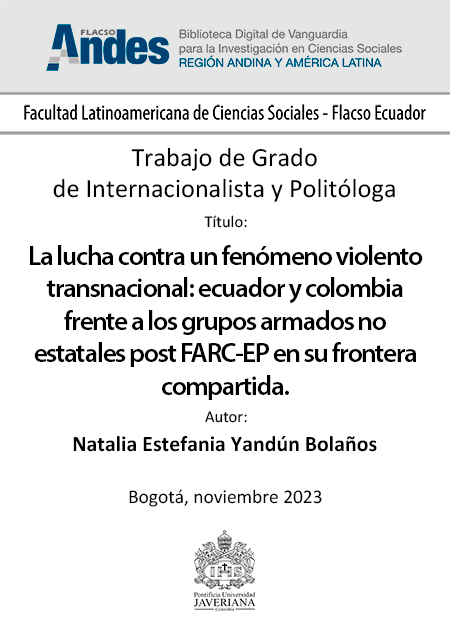 Yandún Bolaños, Natalia Estefania. 2023. La lucha contra un fenómeno violento transnacional : Ecuador y Colombia frente a los grupos armados no estatales post FARC-EP en su frontera compartida. Tesis de licenciatura, Pontificia Universidad Javeriana.