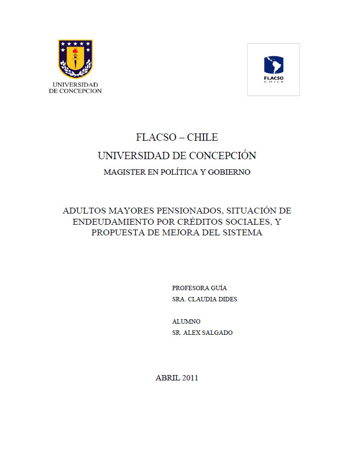 Salgado Aguilera, Alex Andrés. 2011. Adultos mayores pensionados, situación de endeudamiento por créditos sociales y propuestas de mejora del sistema. Tesis de Maestría, FLACSO sede Chile y Universidad de Concepción.