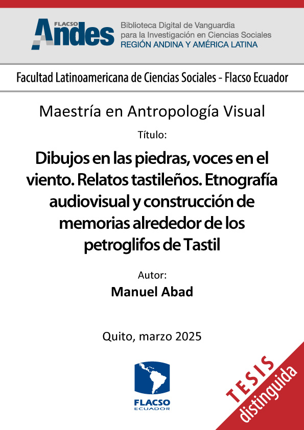 Abad, Manuel. 2025. Dibujos en las piedras, voces en el viento. Relatos tastileños. Etnografía audiovisual y construcción de memorias alrededor de los petroglifos de Tastil. Tesis de maestría, Flacso Ecuador.