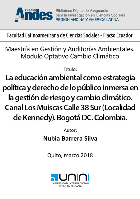Barrera Silva, Nubia. 2018. La educación ambiental como estrategia política y derecho de lo público inmersa en la gestión de riesgo y cambio climático. Canal Los Muiscas Calle 38 Sur (Localidad de Kennedy). Bogotá DC. Colombia. Tesis de maestría, Universidad Internacional Iberoamericana.