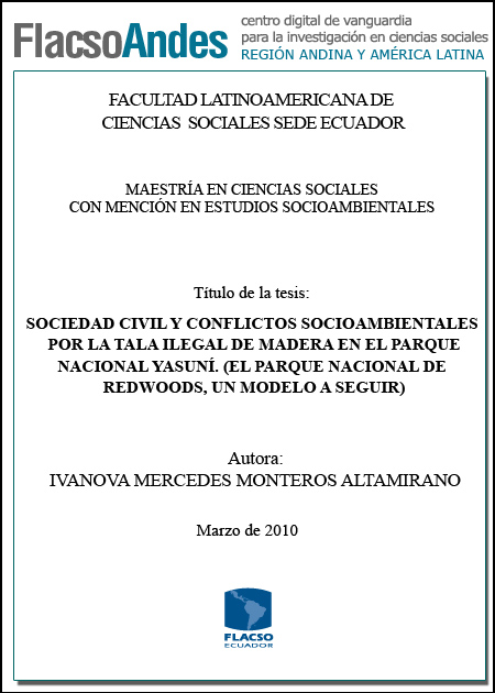 Monteros Altamirano, Ivanova Mercedes (2010). Sociedad civil y conflictos socioambientales por la tala ilegal de madera en el Parque Nacional Yasuní : (El parque Nacional de Redwoods un modelo a seguir). Maestría en Ciencias Sociales con mención en Estudios Socioambientales. FLACSO, Sede Ecuador. Quito. 166 p.