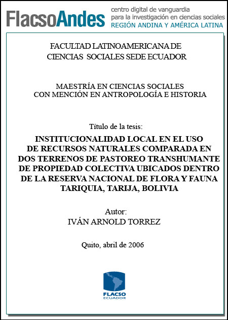 Torrez, Iván Arnold (2006). Institucionalidad local en el uso de recursos naturales comparada en dos terrenos de pastoreo trashumante de propiedad colectiva ubicados dentro de la reserva nacional de flora y fauna Tariquia, Tarija, Bolivia. Maestría en Ciencias Sociales con mención en Antropología e Historia, Derecho y Sociedad o Gestión Ambiental y Desarrollo; [s.l.] : FLACSO, Sede Ecuador : Colegio Andino. Centro de Estudios Regionales Andinos Bartolomé de las Casas. [s.l.]. 120 p.