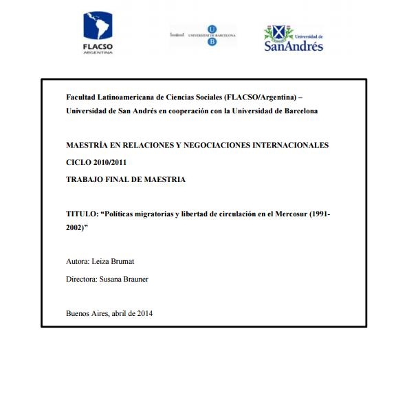 Brumat, Leiza Maricel. 2014. Políticas migratorias y libertad de circulación en el Mercosur : 1991-2002. Tesis de Maestría. FLACSO. Sede Académica Argentina, Buenos Aires.