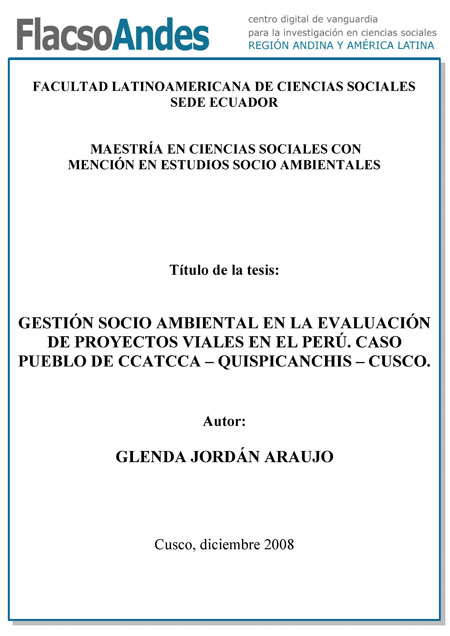 Jordán Araujo, Glenda (2008). Gestión socio ambiental en la evaluación de proyectos viales en el Perú. Caso: Pueblo de Ccatcca - Quispicanchis - Cusco. Maestría en Ciencias Sociales con mención en Estudios Socio Ambientales, FLACSO Sede Ecuador. Quito. 118 p.
