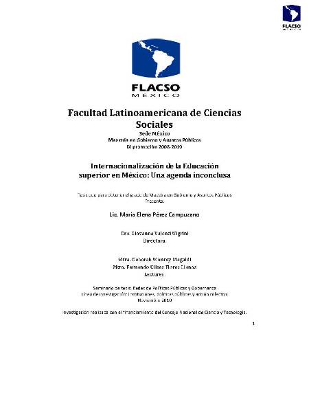 Pérez Campuzano, María Elena (2010). Internacionalización de la educación superior en México : una agenda inconclusa. Maestría en Gobierno y Asuntos Públicos; FLACSO México. México. 168 h.