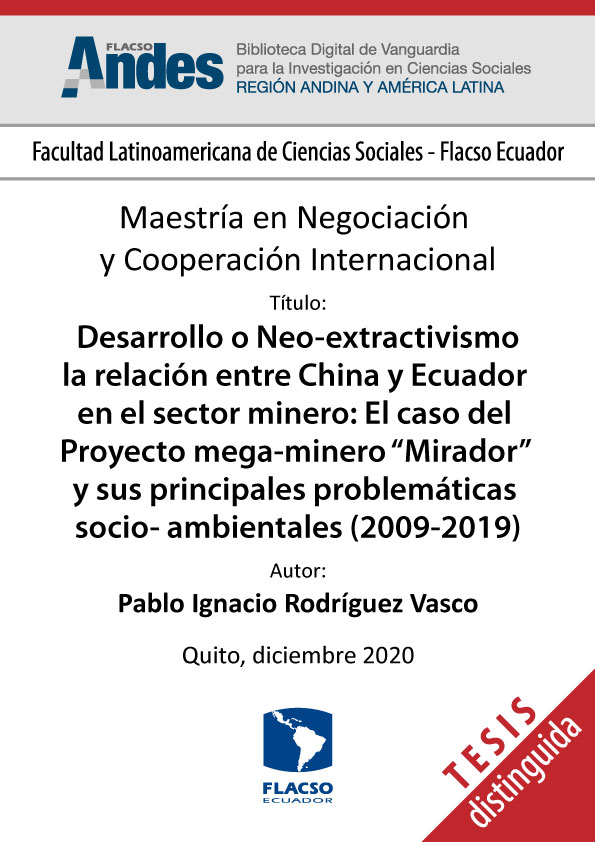 Rodríguez Vasco, Pablo Ignacio. 2020. Desarrollo o Neo-extractivismo la relación entre China y Ecuador en el sector minero: El caso del Proyecto mega-minero “Mirador” y sus principales problemáticas socio- ambientales (2009-2019). Tesis de maestría, Flacso Ecuador.