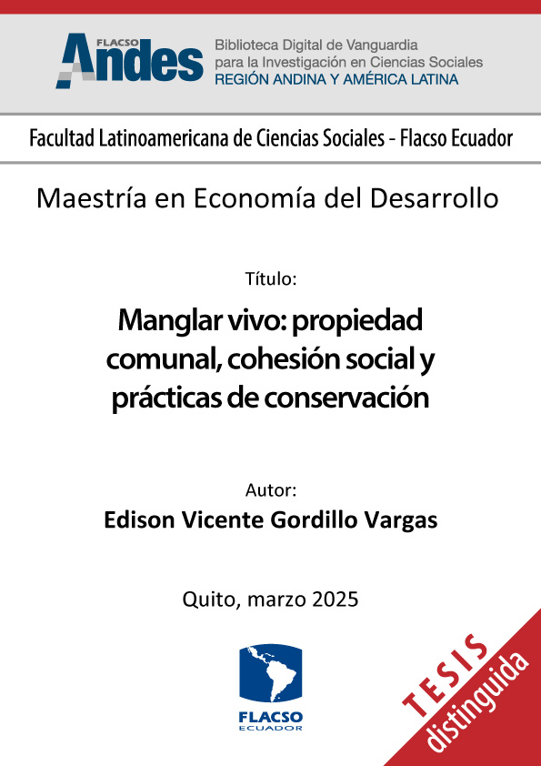 Gordillo Vargas, Edison Vicente. 2025. Manglar vivo: propiedad comunal, cohesión social y prácticas de conservación. Tesis de maestría, Flacso Ecuador.