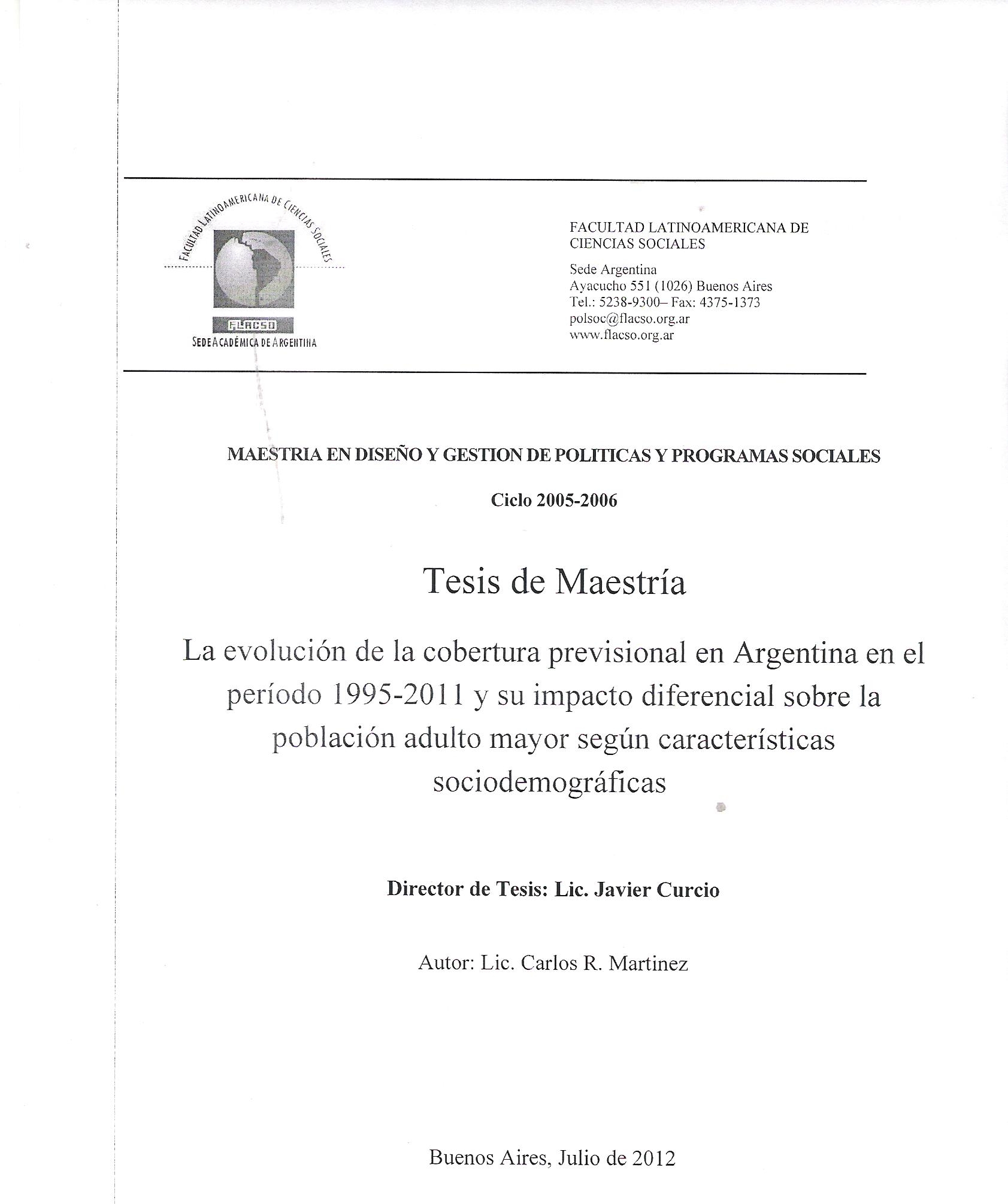 Martínez, Carlos Rodolfo (2012). La evolución de la cobertura previsional en Argentina en el período 1995 - 2011 y su impacto diferencial sobre la población adulto mayor según características sociodemográficas. Tesis de Maestría. FLACSO. Sede Académica Argentina, Buenos Aires.
