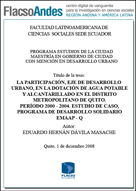Dávila Masache, Eduardo Hernán (2008). La participación, eje del desarrollo urbano, en la dotación de agua potable y alcantarillado, en el Distrito Metropolitano de Quito, periodo 2000-2004: estudio de caso, programa de desarrollo solidario, EMAAP-Q. Maestría en Gobierno de la Ciudad con mención en Desarrollo Urbano; FLACSO sede Ecuador. Quito. 129 p.
