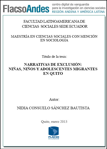 Sánchez, N. C. (2013). Narrativas de exclusión : niñas, niños y adolescentes migrantes en Quito (Tesis de Maestría en Ciencias Sociales con mención en Sociología). FLACSO Sede Ecuador, Quito.