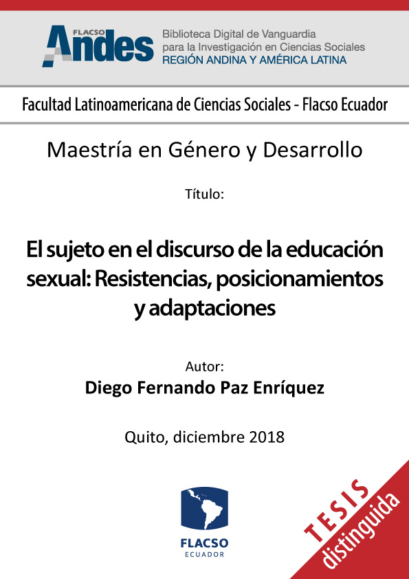 Paz Enríquez, Diego Fernando. 2018. El sujeto en el discurso de la educación sexual: Resistencias, posicionamientos y adaptaciones. Tesis de maestría, Flacso Ecuador.