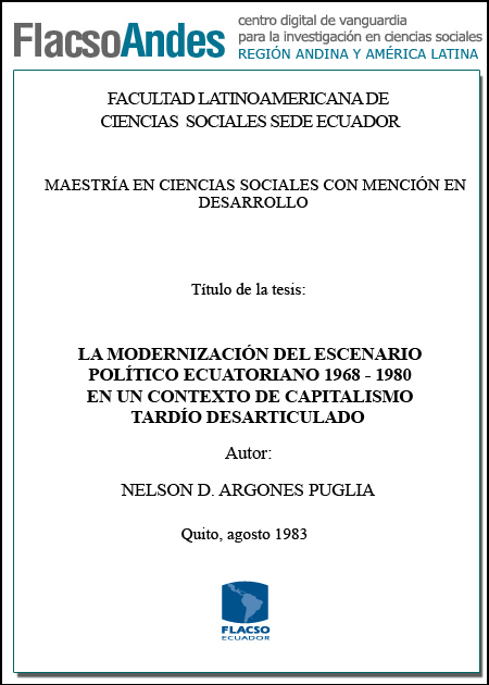 Argones Puglia, Nelson O. (1983). La modernización del escenario político ecuatoriano 1968 - 1980 en contexto de capitalismo tardío desarticulado. Maestría en Ciencias Sociales con mención en Estudios del Desarrollo; FLACSO - Sede Ecuador. Quito. 205 p.