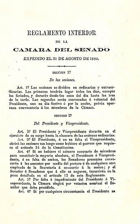 Reglamento interior de la Cámara del Senado expedido el 31 de Agosto de 1880