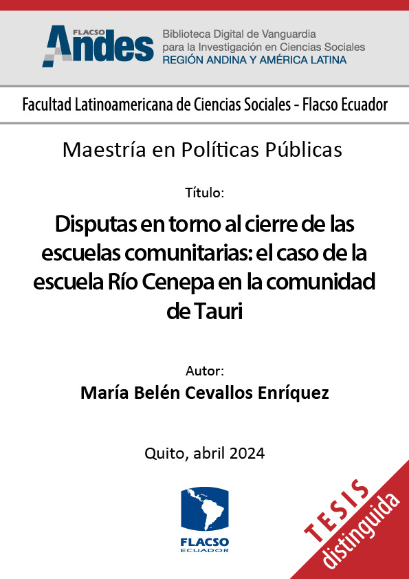 Cevallos Enríquez, María Belén. 2024. Disputas en torno al cierre de las escuelas comunitarias: el caso de la escuela Río Cenepa en la comunidad de Tauri. Tesis de maestría, Flacso Ecuador.