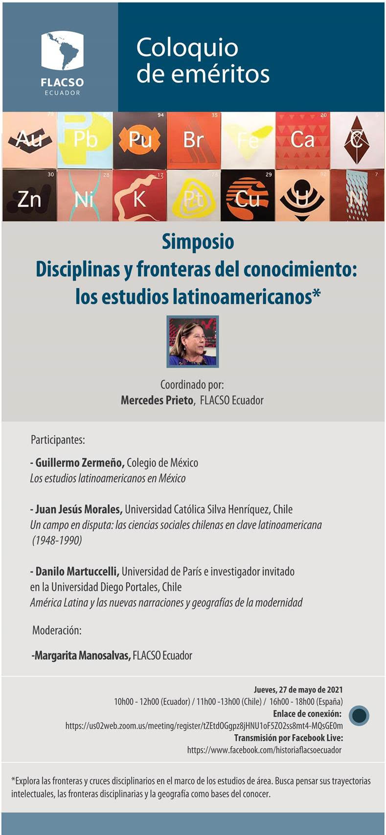 Coloquio de eméritos: Prácticas y materialidad del conocer en las Ciencias Sociales. Discute el interés en la materialidad del conocer y otros enfoques junto a iniciativas orientadas al desarrollo del conocimiento y de las ciencias en América Latina. Jueves, 27 de mayo de 2021 - 10h00 - 12h00 (Ecuador), con la participación de Guillermo Zermeño, Juan Jesús Morales y Danilo Martuccelli.