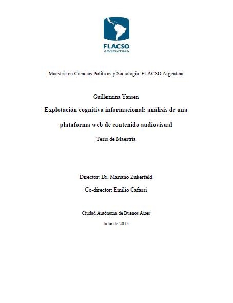 Yansen, Guillermina (2015). Explotación cognitiva informacional : un analisis de una plataforma web de contenido audiovisual. Tesis de Maestría. FLACSO. Sede Académica Argentina, Buenos Aires.