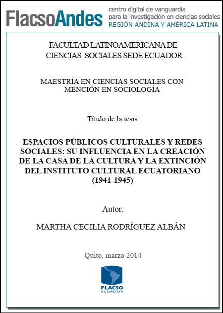 Rodríguez, M. C. (2014). Espacios públicos culturales y redes sociales : su influencia en la creación de la Casa de la Cultura y la extinción del Instituto Cultural Ecuatoriano (1941-1945) (Tesis de Maestría en Ciencias Sociales con mención en Sociología). FLACSO Sede Ecuador, Quito.