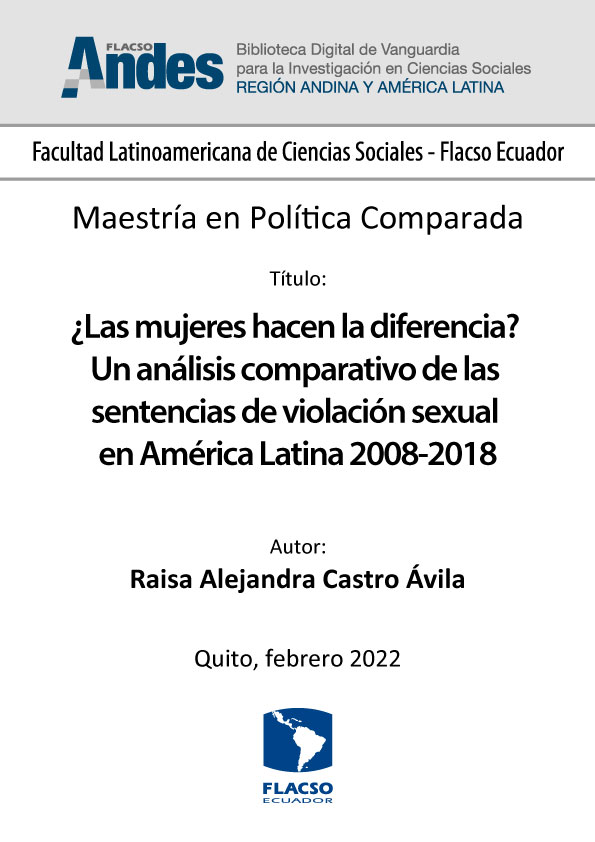 Castro Ávila, Raisa Alejandra. 2022. ¿Las mujeres hacen la diferencia? Un análisis comparativo de las sentencias de violación sexual en América Latina 2008-2018. Tesis de maestría, Flacso Ecuador.