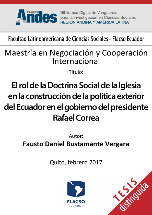 Bustamante Vergara, Fausto Daniel. 2017. El rol de la Doctrina Social de la Iglesia en la construcción de la política exterior del Ecuador en el gobierno del presidente Rafael Correa. Tesis de maestría, Flacso Ecuador.