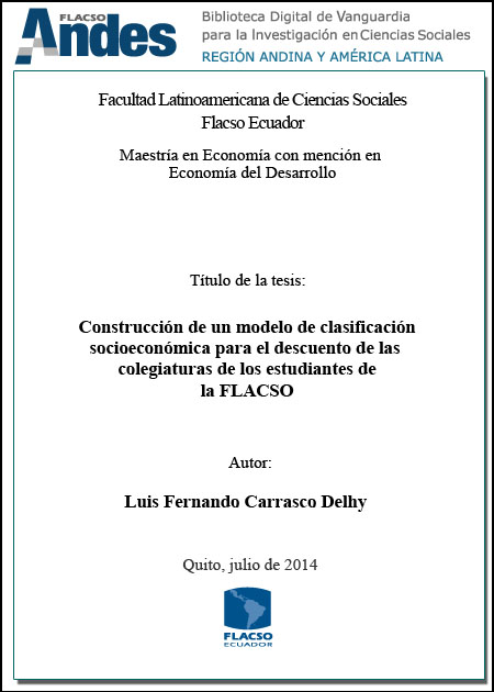 Carrasco Delhy, Luis Fernando. 2014. Construcción de un modelo de clasificación socioeconómica para el descuento de las colegiaturas de los estudiantes de la Flacso. Tesis de maestría, Flacso Ecuador.