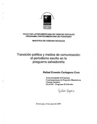 Cartagena Cruz, Rafael Ernesto (2004). Transición política y medios de comunicación : el periodismo escrito en la posguerra salvadoreña. Maestría en Ciencias Sociales, FLACSO Programa Centroamericano de Postgrado. El Salvador. 240 p.