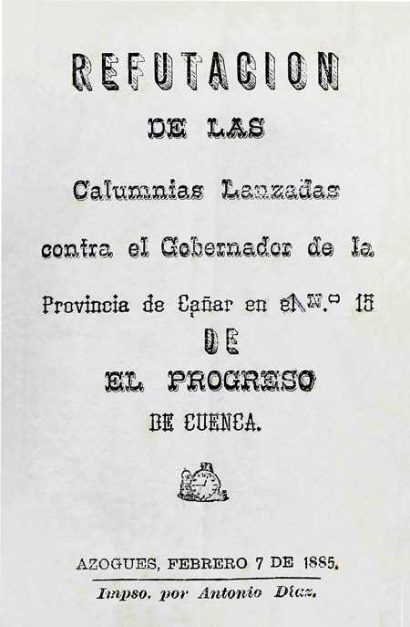 Refutación de las calumnias lanzadas contra el Gobernador de la Provincia de Cañar en el N° 15 de El Progreso de Cuenca (Folleto).