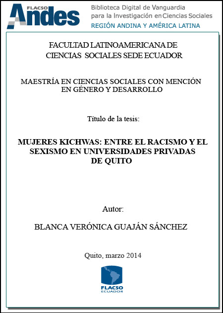Guaján Sánchez, Blanca Verónica. 2014. Mujeres kichwas: Entre el racismo y el sexismo en universidades privadas de Quito. Tesis de maestría, FLACSO Sede Ecuador.