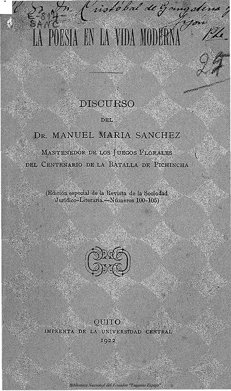 Sánchez, Manuel María. 1922. La poesía en la vida moderna : Discurso del Dr. Manuel María Sánchez, Mantenedor de los Juegos Florales del Centenario de la batalla de Pichincha Discurso del Dr. Manuel María Sánchez, Mantenedor de los Juegos Florales del Centenario de la batalla de Pichincha. Quito : Imprenta de la Universidad Central.