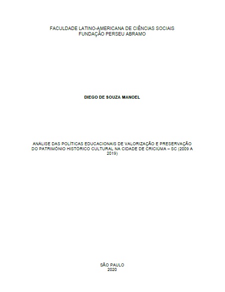 Souza Manoel, Diego de. 2020. Análise das políticas educacionais de valorização e preservação do patrimônio histórico cultural na cidade de Criciúma – SC (2009 a 2019). Tesis de maestría, Flacso Brasil.