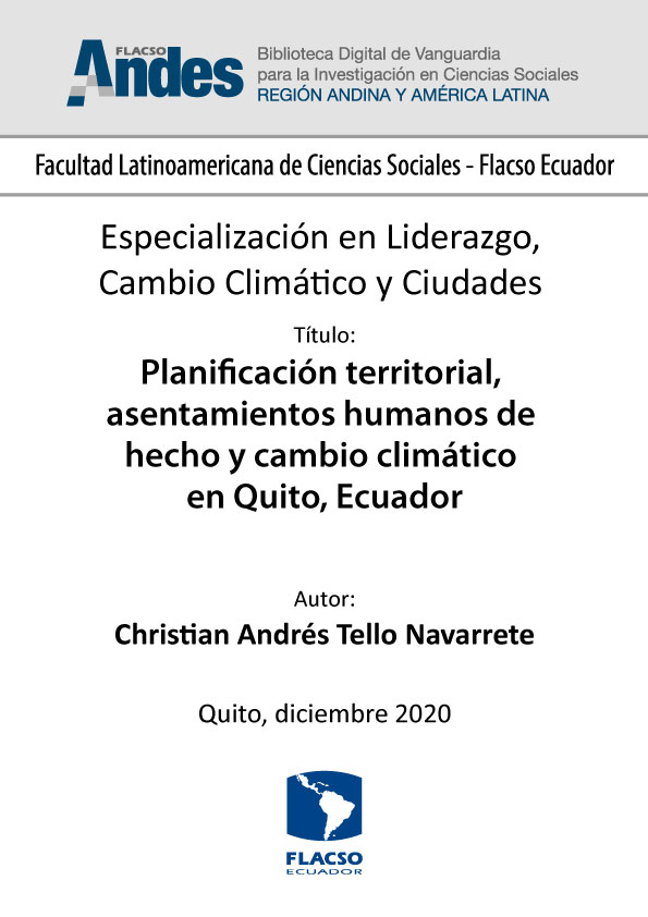 Tello Navarrete, Christian Andrés. 2020. Planificación territorial, asentamientos humanos de hecho y cambio climático en Quito, Ecuador. Tesina de especialización, Flacso Ecuador.