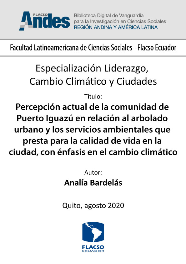 Bardelás, Analía. 2020. Percepción actual de la comunidad de Puerto Iguazú en relación al arbolado urbano y los servicios ambientales que presta para la calidad de vida en la ciudad, con énfasis en el cambio climático. Tesina de especialización, Flacso Ecuador.
